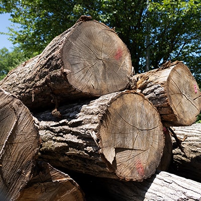 オークヴィレッジの家具は、広葉樹の木目や色を生かすため無垢の木を使用していますが、長い年月をかけて生長したナラやカバなどの広葉樹は、曲がったり、枝があったり、一本一本に個性があり、それが製品ごとに異なる表情を創り出しています。そのため、丸太から製材する際には、樹種ごとの木質、木目の出方、木目方向の伸び縮み度合いの違いやクセである木理(もくり)、曲がり具合などを見極めて、各製品のどの部材に適しているかを判断しています。