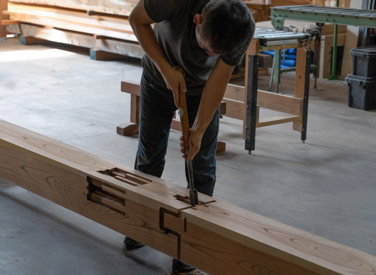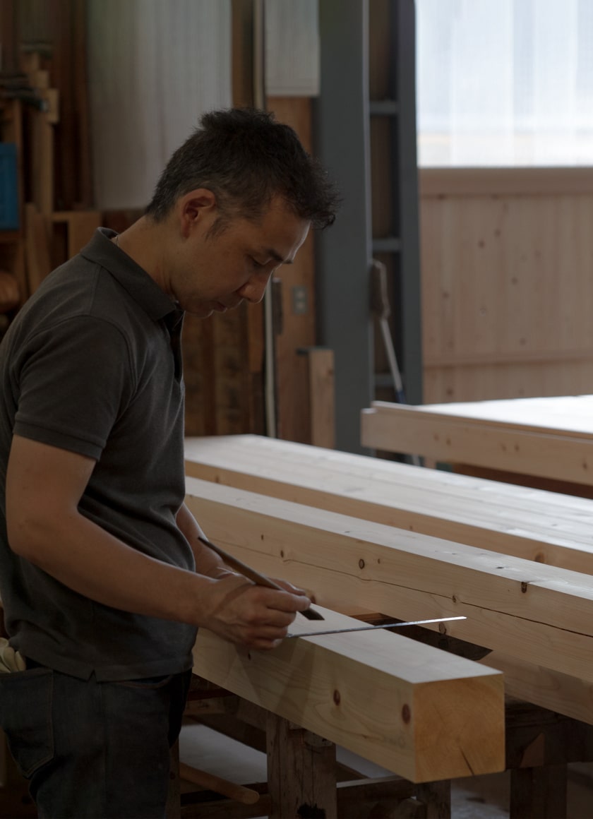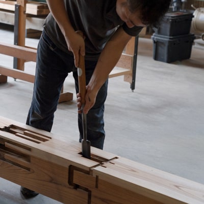 家の柱や梁をボルトで固定したり、椅子の座面と脚を金具で取り付けたりすれば、強度が増して長持ちすると思われがちです。しかし、実際にはボルトや金具は錆びて劣化し、地震や強い力が加わると金物が木の部材を破損させ、結果として家や家具の寿命を縮めます。金物に頼らず、木の特性と用途に応じて加工し組み上げる「木組み」は、伝統に裏打ちされた強さとしなやかさ、そして美しさを兼ね備えた工法。職人の肌感覚で細工される高度な加工技術はもちろん、構造によって接合部にかかる荷重に応じた工法の修得、そして何より木の特性を熟知することが不可欠な、高度な加工技術です。