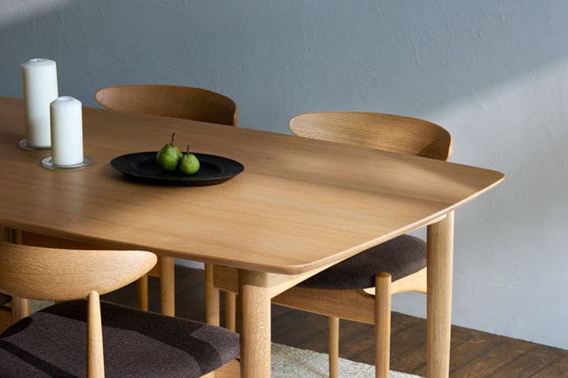 例えば、同じナラでも、若くて粘り気のある材は椅子の脚に、古木の希少な木目の板は食器棚の扉の鏡板に、伸びやかで色目が美しい板はテーブルの天板にと、「適材適所」の使い分けをしています。