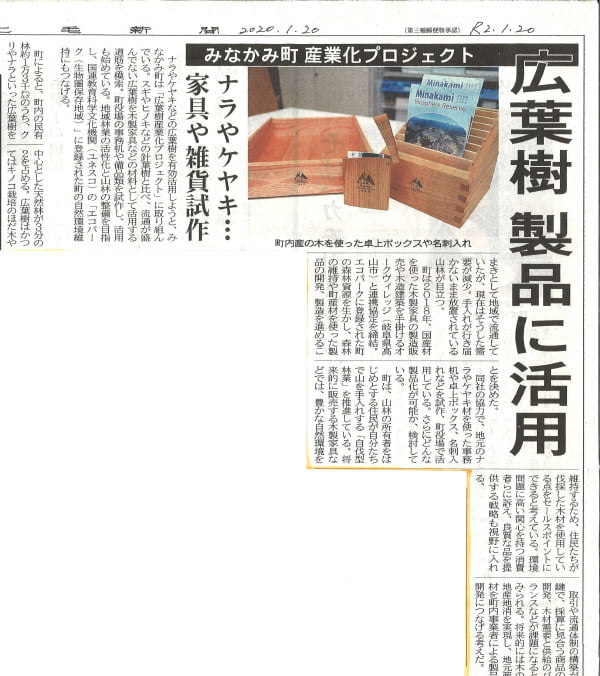 本巣市・根尾地域の森林から造林事業の過程で伐り出された広葉樹のうち、規格外とされているものを、県内の林業者・製材業者と3者連携することで⽊材として活⽤し、⽊製品化して市場で販売しています。