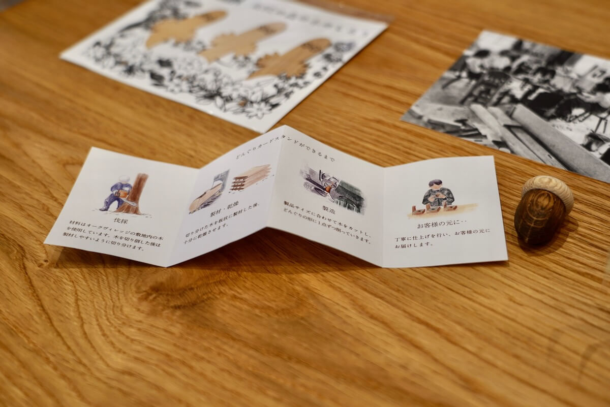 小さなどんぐりのかたちをしたカードスタンド。付属のパンフレットを開くと、お客さんの手元に届くまでの工程があたたかなタッチのイラストで紹介されている。企画からパンフレットデザインまで、佐藤さんが手がけた。