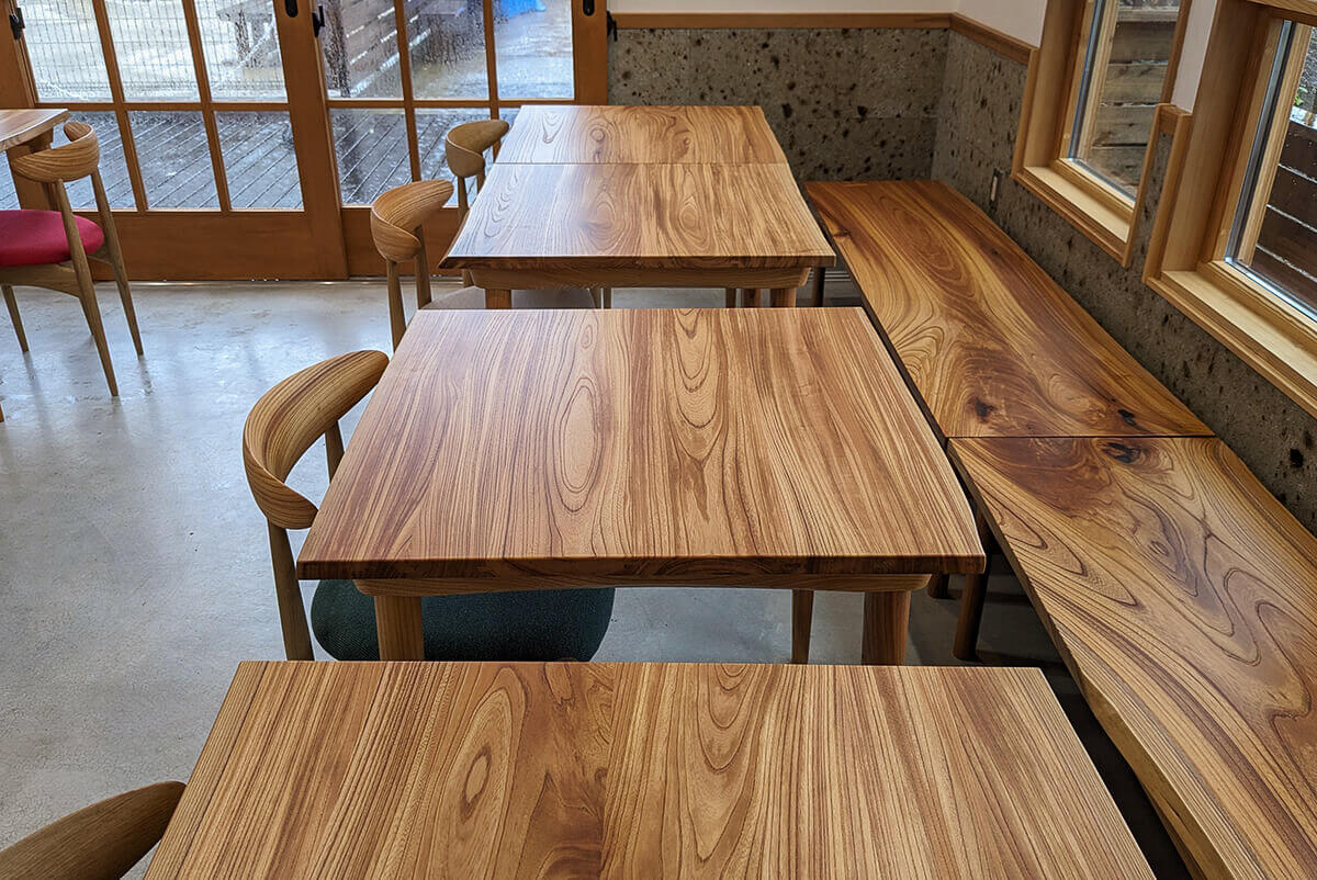 お預かりした7本のケヤキを製材・乾燥し、テーブル6台、ベンチ2台、Swallowチェア8脚を制作。テーブルやベンチには木目を活かした「耳付仕上げ」を施し、チェアの一部にはケヤキ材を使用しました。