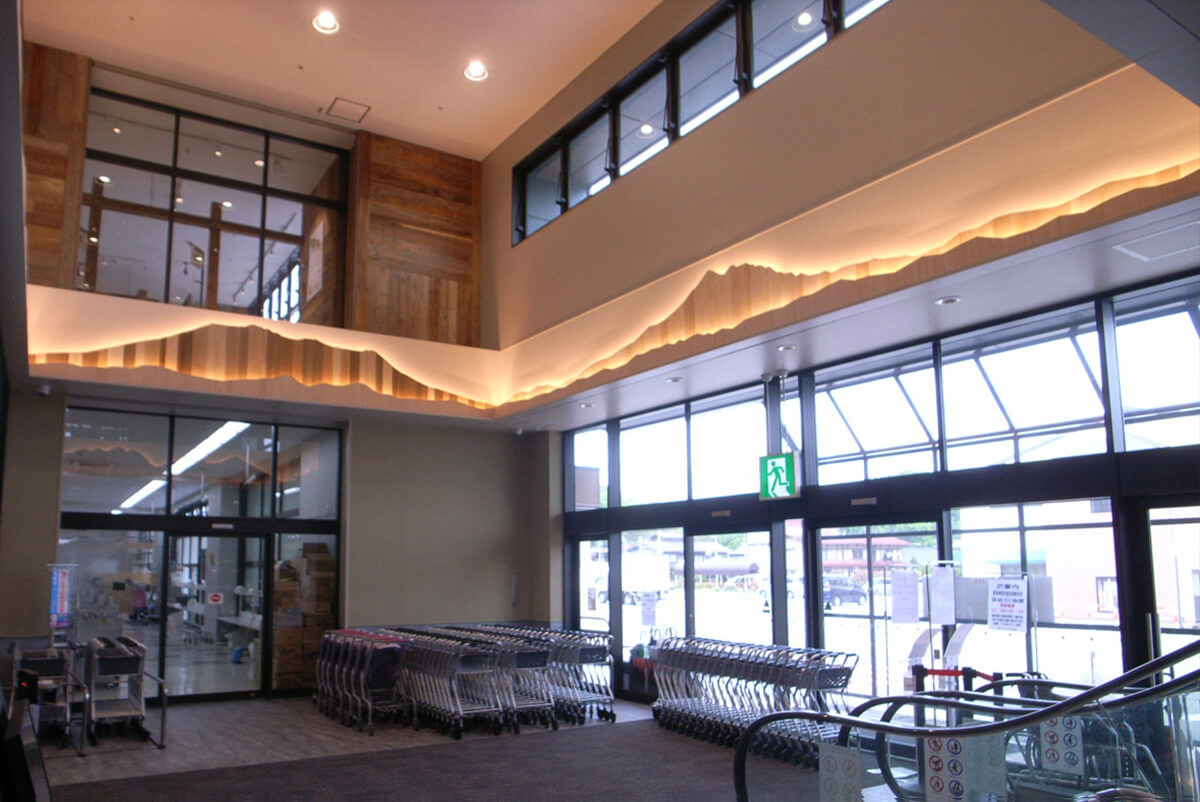 飛騨地方に暮らす人々の生活に根差したお店だからこそ、飛騨地方から見える周囲の山脈をモチーフに、四季折々思い浮かぶ樹種で表現しました。春の乗鞍は、サクラ、秋は紅葉の北アルプスは、ケヤキ、クルミ、イチイ、などなど。