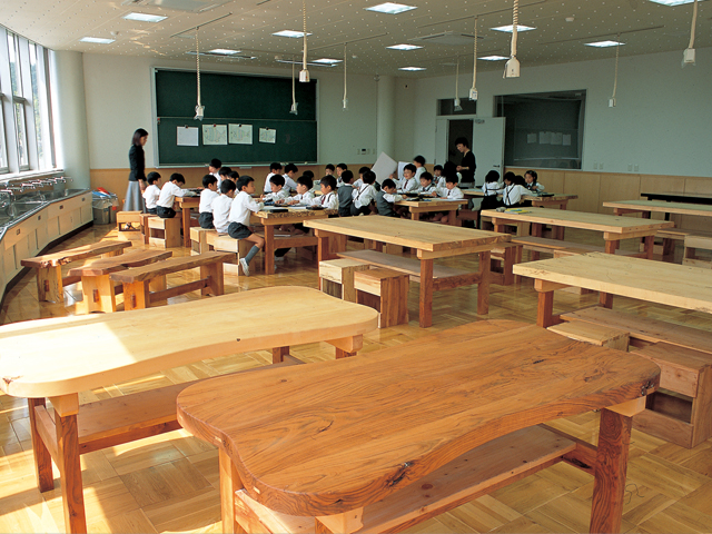 小学校の建設用地で育ったサクラなどの7種類の材を使った工作台や多目的テーブル