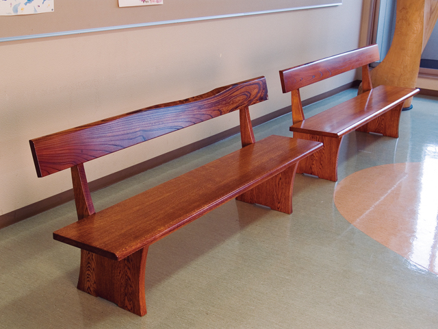 敷地内で伐採したケヤキを使った卒業生の記念品を制作やロビーのベンチなど
