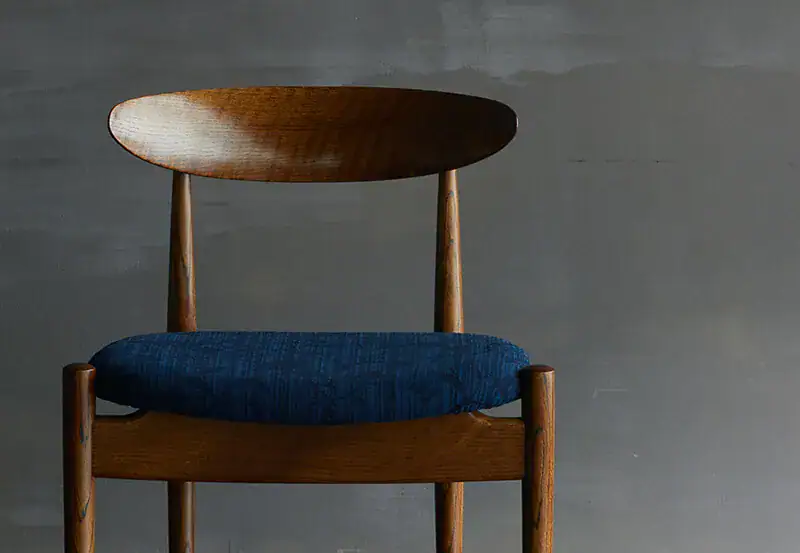 オークヴィレッジのフラッグシップ「Swallowチェア」を漆塗りで仕上げ、座面に群言堂の藍染生地を合わせました。