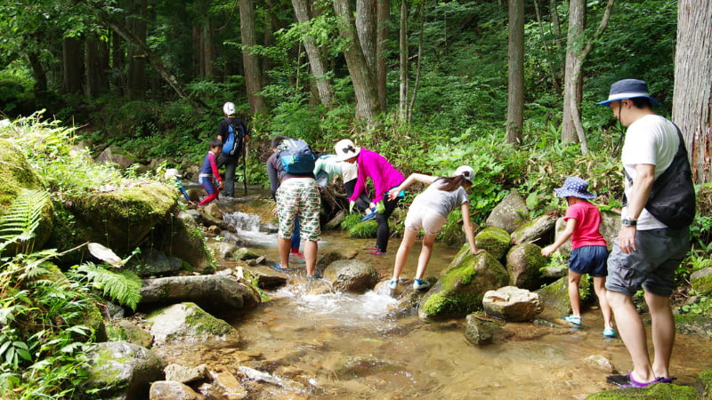 源流にほど近い、山の伏流水が流れるせせらぎは、川魚が泳ぎ、創業時より職人たちが植えた多様な木々が育っています。せせらぎ脇の小径沿いを歩いていただけるようにしています。